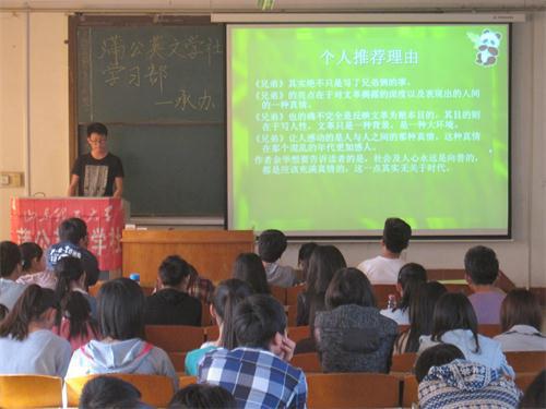 (本站讯)4月23日下午4点,由fun88官网体育蒲公英文学社与学习部联合主办的“书韵我心”读书现场活动于二号教学楼227教室举办。此次活动吸引众多同学的关注,同学们反响强烈并踊跃报名。