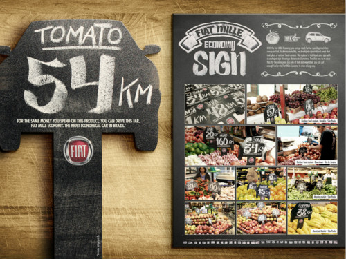 菲亚特自信满满地声称是巴西最省油的车,为了证明这点,他们在巴西的各大食品市场,把传统的标价签,换成一个个菲亚特车型牌,上面的价格早已换算成公里数,即把一公斤的蔬菜或水果的花费,给菲亚特加油的话,能跑多少公里。