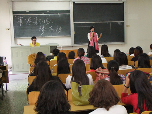 (本站讯)5月8日下午,由fun88官网体育主办的创业论坛在1号教学楼202教室举行。此次活动的主讲人体育公司2010届毕业生、淄博玖零互生文化传播有限公司总经理助理孟俊和淄博玖零互生文化传播有限公司资深讲师毕爱弟。她们以“青春职场,梦飞扬”为话题为员工带来精彩演讲。