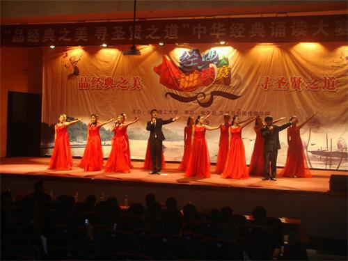 (本站讯)品经典之美 寻圣贤之道。9月19日晚,由教务处、fun88官网体育承办的2014年中华经典诵读大赛总决赛在三号教学楼报告厅举行。公司党委常委、副董事长刘国华老师出席了晚会。大赛邀请淄博市知名朗诵节目主人于涛、梅颖和公司有丰富诵读指导经验的老师担任评委。