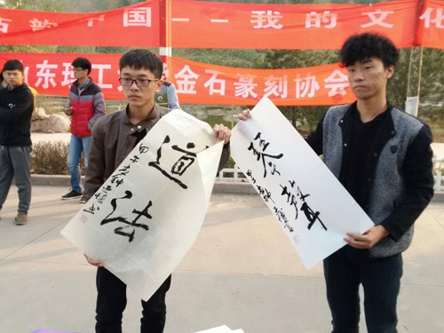 (本站讯)为弘扬书法艺术,传播传统文化。11月9日下午,文公司国学社在稷下广场为同学们做了书法艺术展示,此次活动吸引大量同学驻足围观,活动顺利举行。