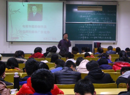 韩磊首先进行了自我介绍,他谦逊的讲说和幽默地表达使现场的气氛活跃起来。他讲述了从写书法转行到电视台的工作,从他一个竞选演讲故事“打假”开始说起了“被动选题”和“主动选题”的问题。他说,电视专题的制作需要涉及很多创作环节,制作节目的选题、构思和呈现方式都需要认真思考,要紧跟时代潮流,了解电视观众的需求,同时也要注意电视节目的艺术性。视频的录制也是一种创作,要保证画面和谐、内容生动,对事物进行多角度、多层次的呈现,关键要“出奇制胜”。后期的剪辑也是非常重要的,需要熟练掌握各种软件,提高自身的技能。谈到现今的媒体广告,他说如今的新媒体层出不穷,而借助新媒体发展的广告更是不断拓宽领域,他勉励同学们在校期间在学好专业课程的同时还应该加强实践能力,注意观察、学习好的广告案例。