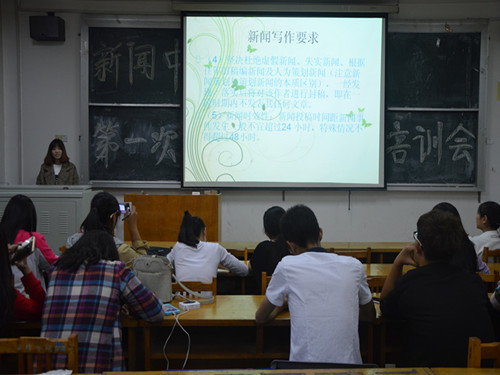 活动伊始,魏泽宇首先表示召开此次培训活动的目的,旨在提高新干事的写稿能力,提高稿件质量。之后,新闻中心的各位新成员进行了简单的自我介绍,第一次新闻培训活动就在愉悦的氛围中开始。培训中,主讲人张金秀向大家介绍了写新闻稿的具体要求,指明了新闻稿应点明时间、地点以及主要参与人员,并表示新闻稿的叙述过程中不能带有主观色彩,强调了新闻稿的写作中应该避免的问题。为了使同学们有更加深刻和直观的印象,她结合实例向同学们展示新闻稿中常犯的错误,并对此类问题提出了修改意见,希望大家能够以严谨的态度对待工作。