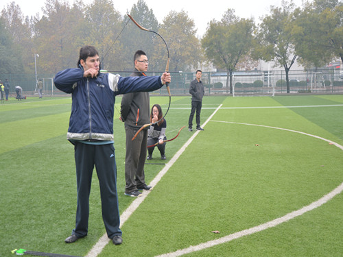 比赛伊始,宁玉忠致辞,表达了弘扬中国传统文化,推广射箭艺术,为老师和同学提供一个射箭古艺带来健康和快乐的平台,学习射箭,体会射箭的健身效益,增进全校师生的运动健身意识的目的。接下来,阿东弓箭制作公司董事长王东为国学社捐赠弓箭,并希望同学们能够热爱射箭这项活动,强身健体。之后,国学社成员进行了射礼展示,天气虽然寒冷,但是每一位参加比赛的同学们的心情却是十分激动,在进行完欣赏完精彩的射礼展示,便进入大家期待已久的比赛环节。射箭场上,只见每位选手雄姿英发,自信十足。此次比赛吸引了大批员工参加,来自哈萨克斯坦的外国职工也积极参与进来,比赛中,他一道白光闪过,正中靶心,在场人员无不叫好。