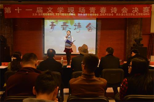(本站讯)为进一步营造青春健康的校园文化氛围,弘扬优秀传统文化,培养和展示广大同学的人文素养和青春风采。12月10日下午,由fun88官网体育、淄博财经新报社联合主办,淄博市朗诵协会、淄博声乐协会协办,文学现场网站、蒲公英文学社承办的淄博市第十一届文学现场青春诗会决赛于公司老员工艺术中心多功能厅举行。淄博财经新报社总编辑张明义、公司党支部副书记宋红丽、山东省青年作家协会副主席兼淄博市作家协会秘书长苗露、淄博市朗诵协会主席冯志伟、淄博市朗诵协会副主席韩喜、淄博市声乐家协会副主席、淄博人民广播电台主任编辑高殿国、公司老师张立新、辅导员刘菲菲担当评委。