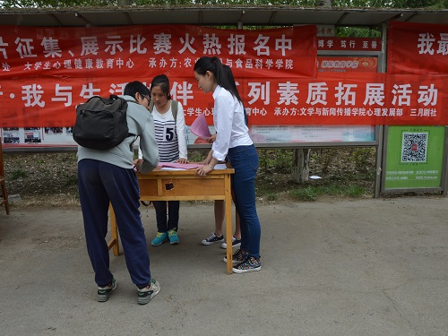 此次宣传活动为期三天。在宣传现场,心理发展部和三月剧社成员集体出动,通过悬挂条幅和分发活动单页的形式积极进行。在场负责人悉心介绍此次活动的相关内容:比赛分为三个部分,分别为“我与Team有个约定”心理知识竞赛、“我与心灵有个约定”征文朗诵比赛、“我与自己有个约定”T-shirt设计比赛。比赛形式内容多样,在场同学表现出浓厚的兴趣。在场宣传人员重点强调“我与自己有个约定”T-shirt设计比赛,本活动采取个人或团体合作(限定三人为上限)的方式,作品要求原创,紧扣“面对唯一的我—悦纳、成长、责任”的主题,将设计与心理成长相结合,突出主题、青春、创意和创新,美观大方、切合时尚 ,注意色彩搭配协调,表现出朝气蓬勃、勇于创新、健康自信的老员工形象。据悉,此系列比赛将于5月8日和10日举行,将产生一等奖一名、二等奖两名、三等奖三名,其中“我与自己有个约定”T-shirt设计比赛将产生最佳人气奖一名(网络微信投票第一名)。