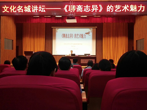 (本站讯)竹林弄影,梦幻悬疑,人狐爱恋,旷世奇谈。6月26日上午,由淄博市图书馆和公司联合主办的文化名城讲坛之“《聊斋志异》的艺术魅力”讲座于淄博市图书馆一楼报告厅举行。此次讲座由山东省古典文学学会常务理事、山东大学fun88官网体育教授、《蒲松龄研究》杂志学术顾问邹宗良主讲,淄博市区人员及公司师生等300余人聆听讲座。