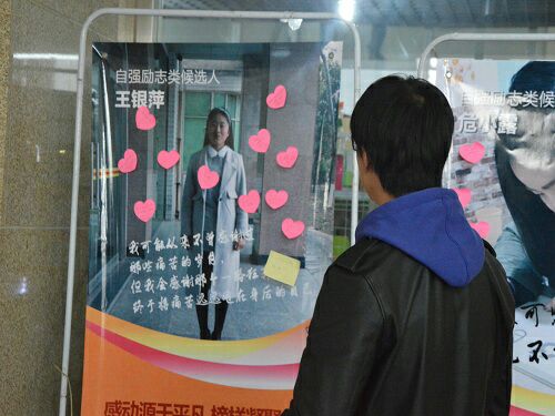 活动伊始,同学们参观着各个展板,仔细阅读展板上的人物事迹,深深地被其中的人物事迹所感动,迟迟不愿离开。同学们拿起便利贴,写上自己要祝福的话,做成心愿卡,小心翼翼地贴在了各个展板上,希望这样能给他们带来力量,也希望自己也变得更加优秀。看到动情处,有些同学眼角湿润,拿起手机对着面前的展板拍照留念。活动结束后,同学们感慨万分,“以前觉得大学里时间充足,可以多玩会,没想到,在他们手里,时间是这么利用的。最近学习找不到方向,可是学姐却是一直在努力学习,从未有过松懈,哪怕大学里有那么多时间可以挥霍,可她依然按照自己的计划走,最终成为一个优秀的人,太令人感动了。”“他们有些人条件很艰苦,却一直自力更生,抓住每一个可能成功的机会,从来没有放弃过梦想,我们眼中的没时间,在他们眼中却是大把的零碎时间,他们值得我们每一个人学习。”同学们如是说。