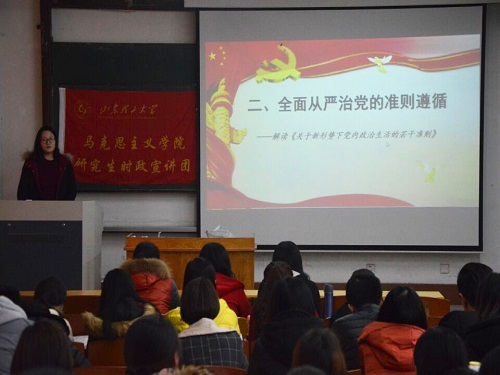 (本站讯)“心中有党,温暖前行”,为引导广老员工党员、员工干部深入学习贯彻十八届六中全会精神,保持党的先进性和纯洁性。12月8日下午,马克思主义公司研究生时政宣讲团于2号教学楼227教室带领大家学习党会精神。党支部书记田明月和公司员工党员、部分员工干部参加了此次宣讲会。