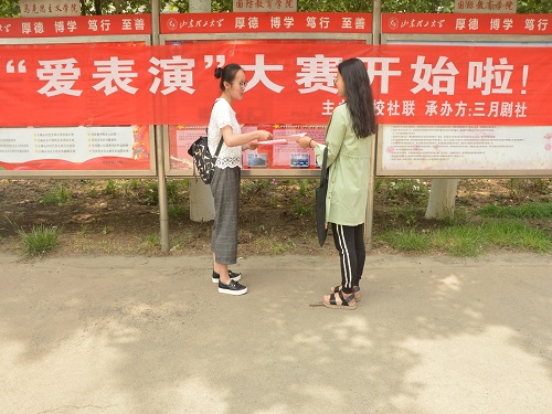 展现多彩生活,致敬舞台经典。活动伊始,三月剧社成员们采用挂横幅、发传单、口头表达的形式向同学们及时传达此次活动的参赛方式和具体内容,从而吸引更多有意向的同学踊跃报名参加比赛。随后,众多热爱表演、思维新颖的同学们当场对此次比赛的举办细节进行了详细的询问和了解并主动积极报名参加,同学们各抒己见、各问所需,参与氛围活跃热烈。此次“爱表演”比赛不限形式和人数,参赛团队可以选择自己感兴趣的表演形式,既可以原创剧本,也可以改编或模仿经典话剧的精彩片段。参赛作品应贴近生活,从实际出发,具有令人动情的感染力,坚持思想性、真实性、艺术性、审美性相统一,充分展现出当代老员工的创新创造精神。作品在给观众带来欢声笑语的同时也应展现出积极乐观、健康向上的人生观和价值观。同时,此次比赛将本着公平公正公开的原则评出分级奖项并为参赛者颁发校级证书,旨在为同学们提供一个展示自我创造能力、团队合作能力和临场发挥能力的舞台。