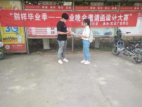 (本站讯)毕业季,放飞一份梦想,把未来追逐;拓展一片天地,把精彩绽放;挥洒一份辛劳,把理想播种;留存一份记忆,把美好刻录。为让即将到来的“毕业季”少一点遗憾,多一份精彩,给毕业生留下珍贵纪念。5月15日中午,由校社联主办、公司支点广告学社承办的校级“别样毕业季――毕业晚会邀请函设计大赛”宣传活动于东校区和西校区第二、三餐厅门口顺利进行。