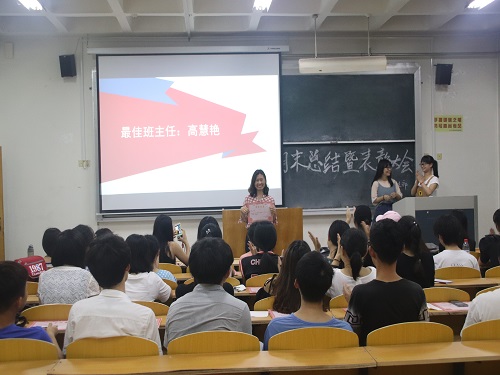 首先,班会进行第一项,班长、团支书、副班长等班级领头人对一年来班级工作进行总结和点评,各位班委站在自身角度、立身员工讲解班级活动举行中出现的情况和欠缺之处,让员工们对班级活动有更进一步的了解。同时,他们也表达对同学们一直以来支持班级工作最真挚的感谢,提前带来假期的祝福。随后,班会进入第二环节。为提高员工自信,挖掘每个人的闪光点,班委联合各舍长为每位同学“量身定制”一个奖项,班级导师高慧艳为每位员工颁奖。现场气氛和谐融洽,展示和谐师生关系和班级氛围。作为班级大家长的高慧艳被评为“最佳班主任”。高慧艳表示对全班同学感谢,感谢一年来同学们的支持和理解并表达对同学们最真挚的祝福和建议。最后,各位同学畅谈一年以来的成长变化,感触颇多,并将写给下一年自己的一封信密封,留作纪念保存。现场气氛热烈,班会在和谐融洽的氛围中结束。