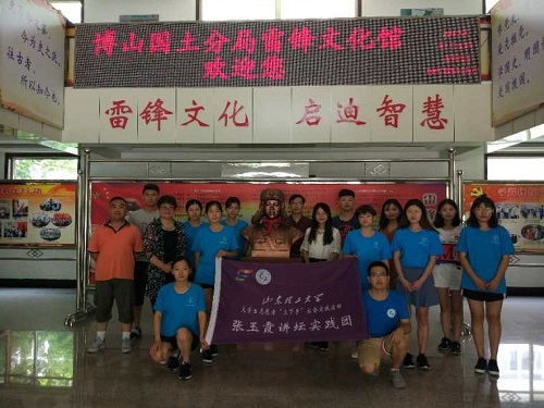 参观雷锋文化馆,物质与精神相持而进。博山国土资源分局自主筹建了雷锋纪念馆,张玉霞讲坛特别前往,向雷锋同志致敬,接受雷锋精神的洗礼。雷锋精神是社会主义精神文明建设的重要组成部分,永不过时,应该时时刻刻被铭记与践行。在物质文明飞速发展的同时精神文明建设应该与之相辅相成。调研中队员们发现,如今博山随处可见有雷锋车队标志的车辆,助人为乐已成为这座城市的精神追求。队员们在工作人员的讲解下,认真接受雷锋文化熏陶,张玉霞在雷锋文化馆里为实践团队员佩戴雷锋纪念章。回驻地途中,队员们主动拾捡路边的垃圾,帮助过往行人,这应该便是弘扬雷锋精神最美的体现。