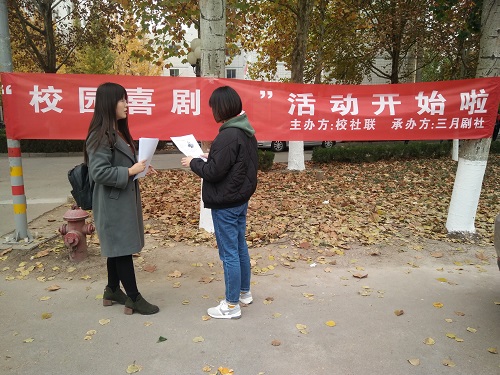 十年一日台下功,看我粉墨登场。活动伊始,三月剧社社员们采用挂横幅、发传单、口头表达的方式向同学们及时传达此次活动的具体内容和活动流程。而后,工作人员对比赛目的、参赛流程及活动要求做了详细介绍。此次活动坚持“为表演梦搭建舞台”为宗旨,本着宣传喜剧文化、丰富校园生活的意愿。随后,工作人员向现场报名者对活动规则做简要说明,活动要求每组参赛选手成员不超过8人,自选喜剧剧本,在喜剧效果中突出正能量,让观众们在观赏过程中感悟喜剧魅力。在宣传过程中,社员们热情地与同学们互动交流,吸引了众多喜剧表演爱好者们前来咨询,同学们踊跃报名、积极参与,活动现场气氛十分活跃热烈。据悉,活动分为喜剧比赛和专场演出两个环节,在11月25日下午的喜剧比赛中胜出的团队将会在12月3日晚进行专场表演。