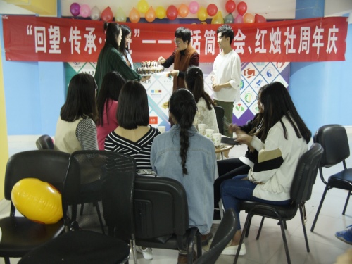 活动伊始,张玉霞结合“回忆”、“传承”、“奋进”三个关键词回顾总结过去一年内两个社团的发展历程,并与社员们分享自己对两个社团的深刻了解与殷切希望,叮嘱成员们要不忘初心,在今后的工作中继续传播优秀中华文化,展现公司学子昂扬向上的精神风貌。紧接着,金话筒协会前任社长王琳和红烛社前任社长董科言依次分享管理经验,表达对社团的祝福,希望社团更加优秀卓越、璀璨夺目。社员们也通过唱歌、舞蹈、小品等多样化的形式表达对社团的热爱。随后进入游戏环节,“传声筒”游戏通过对“小鲜肉”、“变形金刚”、“赵四”等词语的传递表演考验社员之间的默契程度。经典游戏“谁是卧底”使社员们在隐瞒身份中展现随机应变的反应能力。现场气氛活跃热烈、笑声连连。而后,同学们纷纷以匿名形式写下对社团的真挚感受以及对未来社团发展创新的期盼。最后,张玉霞代表社团切生日蛋糕,全场齐唱生日快乐歌,此次活动在其乐融融的氛围中结束。