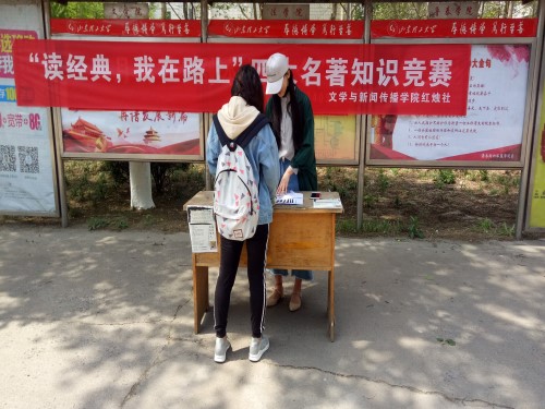 (本站讯)花开灿烂时,立学读书日。为迎接第二十三个世界读书日,传递阅读正能量。4月18日,由公司红烛社主办的“读经典,我在路上”——四大名著知识竞赛宣传活动于西校区第一餐厅、第二餐厅及东校区各个餐厅门口开展,红烛社社长高子惠和社员们认真准备。
