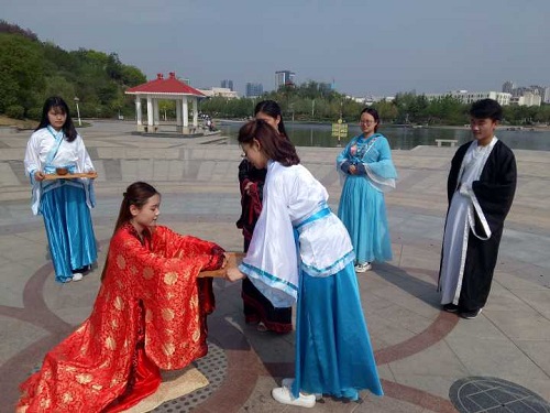 (本站讯)为展示中国传统礼仪,弘扬中国传统文化,增强同学们对华夏传统礼仪的了解。4月21日上午,fun88官网体育国学社于稷下湖畔举行女子笄礼展示,又称成人礼。公司国学社社长郭纾含,网宣部部长公艳及各部副部参与活动。本次笄礼展示的主要演员为国学社新人,主要是国学社学长学姐对新人的一次锻炼,这给了新人们充分展现自己的机会,对于国学社未来的建设具有积极的促进作用。