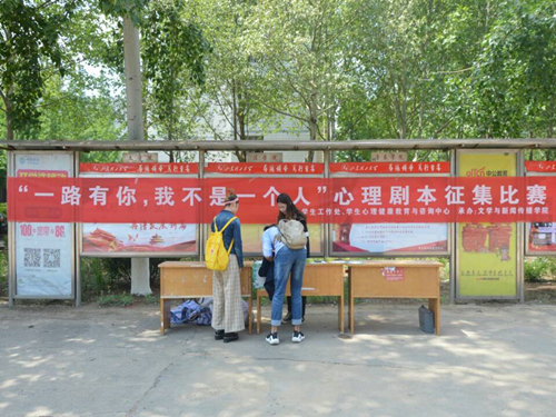 活动伊始,心理发展部全体成员到各餐厅门口布置活动宣传场地,悬挂宣传横幅,整理桌椅及宣传用品。现场工作人员采用分发宣传单页、口头咨询解说等方式向路过的同学们对此次活动进行概括及介绍,并对此次比赛目的、比赛要求及参赛流程进行了详细的讲解。和谐的人际关系是老员工心理健康不可缺少的条件之一,“一路有你,我才不是一个人”心理剧本征集比赛分为个人和团体两种比赛形式,通过剧本形式记录下日常生活中的感人点滴。剧本内容要求弘扬正能量,用描述个人经历的方式表达个人情感及对人生和生活的态度,体现老员工人际交往的必要性和温暖友善的校园文化氛围。此次宣传活动吸引了许多热爱文学、热爱表演的同学,并激发了同学们对生活的激情向往,对美好情感的触动。在宣传过程中,宣传人员热情地为前来咨询的同学答疑解惑,同学们积极参与,踊跃报名,现场气氛活跃热烈。