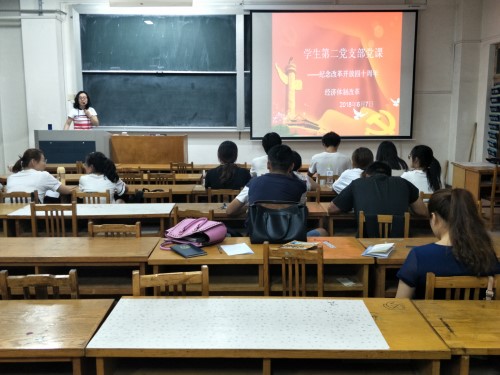 (本站讯)6月7日晚,员工第二党支部书记田明月在1号教学楼417教室为支部全体员工党员和党员发展对象上党课。