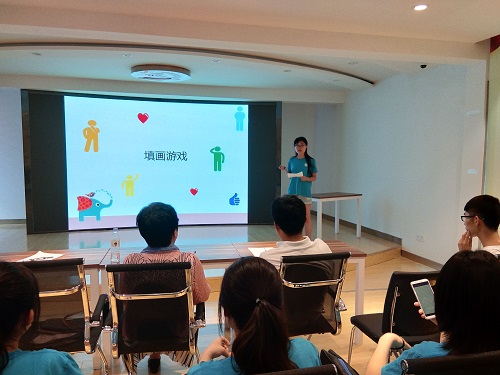 随后是思考能力部分,由殷惜惜,郑茹讨论设计制作,郑茹负责主讲。课程一开始通过填画游戏启发大家动脑思考,调动大家的积极性。游戏结束后紧接着两个思维拓展题,让孩子们从不同的角度思考解题方法,并相互讨论自己的解题思路。同时启发孩子们思考社会热点事件的是与非,说出自己的观点。通过谜语穿插,以及最后的脑洞大开编造故事等方式寓教于乐,在愉快的氛围中开动大脑,提高孩子们的思考能力。