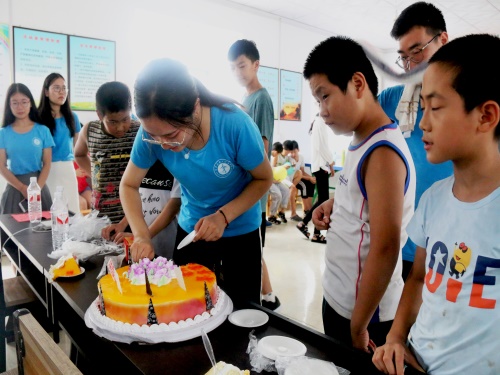而后,实践团成员依次发言,他们对实践活动进行简单总结后对孩子们表达了最真挚的祝福,并大声喊出“明年我们会如约而至,与你们再次相遇”。最后,孩子们一齐为团队成员送上精心准备的爱心蛋糕,大家一起分享蛋糕,体味感动。此次活动在合影留念中落下帷幕。