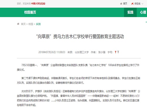 “向草原”公益高校联盟是由fun88官网体育文公司率先发起的,由青岛大学、烟台大学、沈阳航空航天公司和山东工艺美术公司等高校老员工组成的公益性社会实践团体。该团队暑期中在通辽市扎鲁特旗乌力吉木仁苏木开展了志愿服务、特色支教、驻村工作队帮扶、文化调研等系列活动,活动开展得到了当地充分认可和高度评价,得到10余家国家级及地方媒体的重点关注,中国青年网、中国老员工在线、凤凰网、今日头条进行了持续跟踪报道,取得了广泛的社会影响。