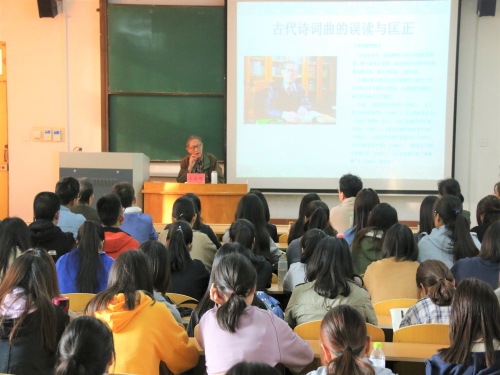 此次报告会以“古典诗词曲的误解与匡正”为题。会议伊始,主持人对王星琦教授做简单介绍,对他的到来表示热烈欢迎。而后,王星琦就自己的读书笔记与学习收获同听众们进行交流互动。他首先讲到诗词是一汪活泉,读者要善于捕捉其中的意境与美感,并简要叙述唐诗、宋词、元曲的发展历史。另外针对古诗误解的问题,王星琦提出单纯了解文面和不理解字面两个层次,他从中华经典古诗词入手,举例说明要想深层理解诗文,必须结合时代背景对诗文中的文字做考究,细细品读。紧接着,他提出“诗不可译”的观点,认为对古典诗词过度的拆分解译会消磨其美感,并从中引出他对“追忆”与“美”的理解。王星琦在讲解过程中谈吐儒雅、细致入微,讲解十分清晰易懂,体现出他深厚的文学功底、严谨的治学态度。