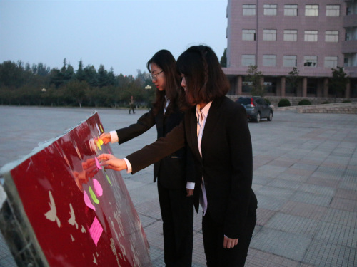 紧接着,青年员工代表李冬旭带领全体同学在国旗下高举右手宣读入团誓词,同学们慷慨激昂,誓词响彻鸿远楼广场。升旗仪式结束后,同学们纷纷在条幅上签字留念,并把写有自己对未来梦想盼望和争做“五有”青年决心的彩色便利贴张贴在展板上。