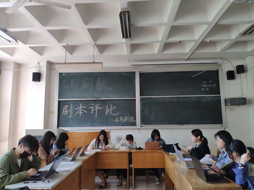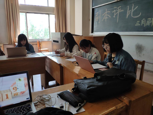 (本站讯)4月14日下午,公司三月剧社承办的公司主题剧本征集大赛审稿现场在西校区1号教学楼321教室进行。公司社联主席岳敏,蒲公英文学社社长张乐,红烛社社长李滕,三月剧社部分成员参加此次活动。