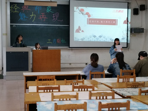 (本站讯)4月27日,公司三月剧社在1号教学楼321教室举行了“经典印象,魅力再现”活动。公司社团服务中心主任岳敏,三月剧社社长李瑾、表演部部长戴玥、编导部部长周炫欣、活动部部长陈旭华以及各个参赛小组参加此次活动。