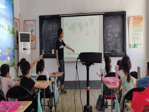在课间休息后,地理课由“丝雨”行教社会实践团队员史添宇主讲。他给同学们介绍了七个大洲并且带领同学们讨论了与几个大洲板块相似的形状,并教给同学们记住这几个大洲的口诀。由大及小,紧接着,史添宇便介绍到了与当地有关岛屿、群岛和海峡的知识,同学们对此都有着极大的兴趣。