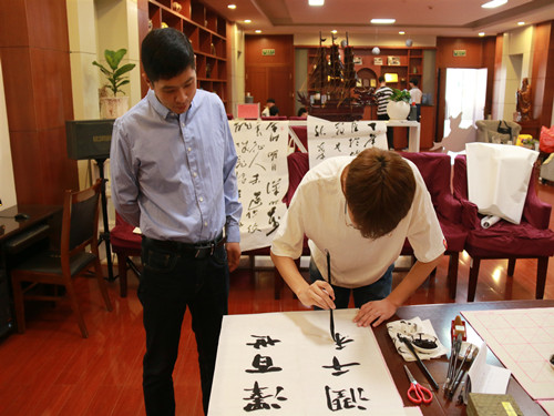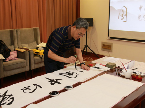 此次活动旨在以书法创作的形式共同庆祝祖国七十周年华诞,进一步增强同学们的使命感和荣誉感,凝心聚力、激发干劲,为班级公司做出新贡献。此次活动以交流会的形式开展,由师生共同完成书法作品。活动伊始,王曦、侯郅琦对各位领导老师的到来表示热烈欢迎和诚挚感谢。而后,同学们分为两组,分别用提前准备的笔墨纸砚进行创作。创作过程中,同学们写下“谦谦君子,温润如玉”、“我爱你,中国”等字样,认真仔细,一撇一捺中尽显文院学子对公司和祖国的热爱。在同学们写字时,李义勇、刘晓东在一旁悉心指导,纠正同学们的拿笔姿势并耐心讲解软笔字的写法。现场氛围轻松融洽。此外,李义勇在宣纸上写下诗歌以及“我爱你,祖国”字样,做出榜样形象,同时展示出他对祖国的热爱以及对同学们寄予的谆谆教诲。现场掌声一片。最后,师生合影留念,同学们高喊“我与祖国共奋进,我们都是追梦人”,展现出文院学子良好的精神风貌。