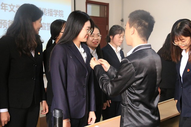 仪式伊始,全体人员起立,在庄重肃穆的氛围中奏唱国际歌。而后,盖奕洁简要介绍预备党员的基本情况,并带领他们进行庄严宣誓。在党旗下,每个人怀着激动的心情,紧握高举右拳,铿锵有力地宣读入党誓词,坚定的目光和严肃的神态彰显出她们对党的忠诚和对初心的坚守。宣誓完毕后,由老党员为预备党员佩戴党徽,并赠送《党章》,希望他们增强党员意识,明确党员责任,并表达了对他们殷切的期盼。