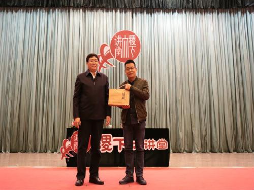 公司党委副书记衣玉琛在讲话中肯定了徐则臣的成就,对徐则臣取得的荣誉高度赞扬,鼓励全校师生利用珍惜交流平台,把握学习机会,预祝稷下大讲堂圆满成功,并向徐则臣颁发活动纪念品。首先,徐则臣讲述个人写作的灵感——京杭大运河。他以作品《北上》谈起,一条河参与了他的童年,一条河承载了他对辽阔世界的想象,是他儿时理解世界的载体。他回忆了自己儿时的故事,在创作中进行加工想象,《北上》应运而生。随后,他介绍自己的写作过程。一次偶然的聊天,徐则臣决定将所认识的运河通过“望远镜”“显微镜”更深层次化。他对运河进行深入细致的研究和调查,读书,实地考察,发现运河不一样的艺术感。因此,他建议同学们写作要结合实际:绝知此事要躬行,从实际中来,到实际中去。接着,他总结自己写作运河的原因。其一,徐则臣自身对运河的深厚情感上。运河是他写作的母体,更是他对人生轨迹的诠释。其二,运河自身的的作用。他引经据典,阐释运河在经济、政治、文化等方面不可或缺的作用。其三,运河本身的艺术感和流量。运河的艺术感是徐则臣写作的灵感和源泉,更是作品艺术魅力的展现。