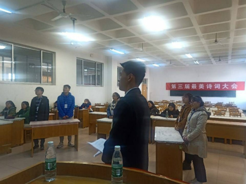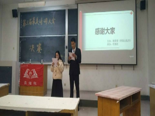 (本站讯)品诗词之美,赏古风古韵。12月1日下午,第三届最美诗词大会决赛在1号教学楼314教室举行。此次比赛由红烛社举行,公司社联主席岳敏以及金话筒协会会长孙广妍担任评委。