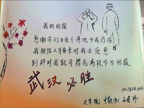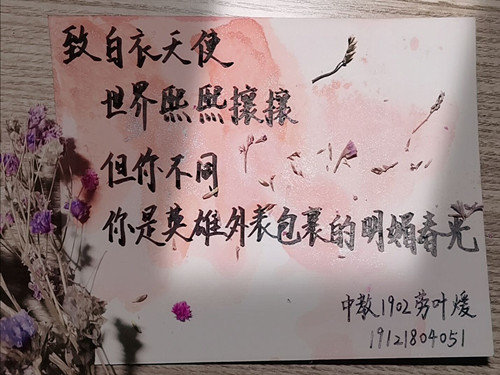 2月16日,由fun88官网体育蒲公英文学社组织主办的“你我同行——致最美逆行者”手写三行情诗征集活动顺利举办。对于此次活动,同学们反响热烈,参与积极性高涨,投稿共计百余幅作品,以传达自己对祖国、对武汉、对防控疫情工作者的美好祝福和敬意。作品中有的诗文极富感情,读来让人为之动容;有的用或娟秀或潇洒的笔迹,挥洒为祖国加油的一腔热血;有的寥寥几笔,医务工作者的形象便跃然纸上;有的善用点缀,把诗句中的情感衬托的更加细腻动人。经过严格的评审,蒲公英文学社最终挑选出25幅作品参与了获奖评选,共设置一等奖3名,二等奖6名,三等奖8名,优秀奖8名并将获奖名单进行公示。