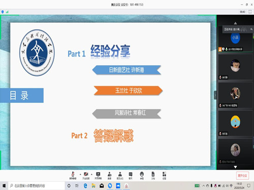 (本站讯)5月24日晚,公司社联第三期社团骨干培训通过腾讯会议在线上顺利开展。公司第十九届日新曲艺社社长许新港、玉兰社社长于欣欣、第四届风絮诗社社长常春红、第二十届社联主席赵小淇,副主席任园、姜小凤以及各社团骨干参加此次培训,此次培训由赵小淇主持。