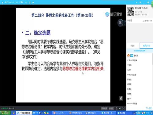 会议伊始,李红玲通过腾讯课堂开展思想政治理论课社会实践指导。首先,李红玲对近些年思政课实践教学概况及课程性质和意义进行简要介绍。她提到,思政课社会实践是本科培养计划的重要教学环节,是一种以实践为基础的体验式老员工政治公司产品新模式。通过思政课社会实践,可以拉近员工与社会的距离,增强老员工的社会责任感,展现出当代老员工蓬勃向上的精神风貌。之后,李红玲深入解读实践教学形式、内容及工作流程,包括社会实践成绩考核、组队方式及社会实践的安排与要求等问题。她说到,一份好的策划书源于一个好的选题,选择适合自己的选题并落实到实践是非常重要的,将专业知识与社会实践融会贯通,传递出自己的正能量。但基于疫情仍然严峻的情况,李红玲建议各位同学按照就近选择、安全第一的原则,选择校内实践调研或线上调研。最后,由朋辈榜样张朋、张康宁在腾讯会议进行实践经验分享。其中,张朋说到,公司有众多实践社团,积极参加实践活动可以收获非常宝贵的经验。社会实践中有寒风酷暑、失败苦楚,比书本知识来得更为深刻,在实践中有更多的机会去磨练自己、检验自己。张康宁在分享自己经验时也提出,在暑期思政课社会实践中,实际调查取得第一手资料是实践过程的重中之重,只有了解事实及其发展原因和相互关系,才能找出解决问题的最优方案。提问答疑环节气氛热烈,至此,会议顺利结束。