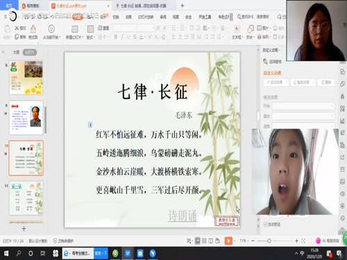 红色教育就是对员工进行爱国主义教育和革命传统教育,遵循寓教于乐的原则,结合重大节日和纪念日,对员工开展丰富多彩的“红色教育”。我国有着光荣的革命传统,而儿童又是国家的未来。对于正在成长的孩童们,红色教育不仅仅可以使他们了解这样一份可歌可泣的中国革命历史壮歌,也让可以激励他们养成良好操守、树立正确人生观,激发他们的爱国热情,让红色革命精神代代传承,也让中华民族的美好品德在无形中发扬光大。因而,“行知”实践团将此次支教活动的第三堂课主题设计为“追寻红色印记”,并将课程主要内容定为《义勇军进行曲》知识、长征故事、长征精神等。因为面对的是二年级的孩子,考虑到他们的年龄,主讲第三堂课的志愿者张明明更是在PPT中添加了故事图片、诗朗诵视频等,尽可能地使课堂更加生动、容易接受。尽管受到疫情的影响,但团队成员们仍希望可以用灵活有趣的线上课堂尽可能地打破时空限制,让红色教育更加深入孩子们的成长,使一颗颗稚嫩的心灵从小便受到红色文化之水的灌溉。