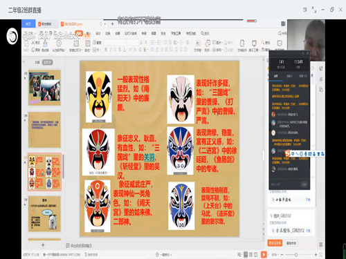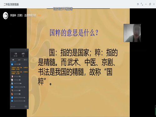 京剧是我国最具代表性的国粹,能够展示华夏民族的浓厚传统,经过数百年的传承演变,这种古老的艺术奠定了中国文化的艺术底蕴。孙金金谈到,学习传统文化,对于京剧的了解与认识必不可少。首先,孙金金对京剧的起源、脸谱、四大唱法等内容做了简要介绍。之后,孙金金通过播放一些京剧的趣味视频,激发同学们对京剧的兴趣,并将一些重点知识穿插在视频中,以一种孩子更易接受的方式讲授给他们。而后,孙金金带领大家领略书法与国画的风彩。在书法方面,孙金金主要为大家介绍书法家王羲之和王献之;在国画方面,孙金金为大家系统介绍了画家齐白石,通过播放一些书法和国画的图片作品和视频,让同学们进一步增进对他们的了解,提高审美艺术水平,这对于弘扬我国优秀的传统文化,继承民族经典具有重要作用。