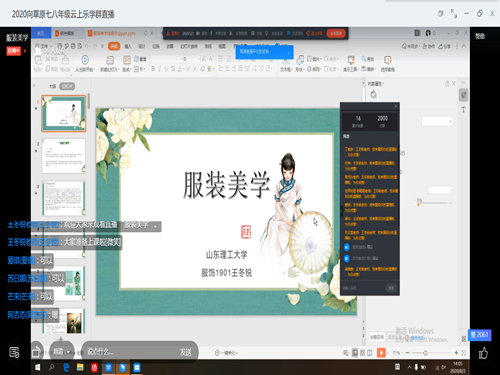 此次课程内容主要包括“服装与美学”“服装材料特点及其对服装美的影响”“着装选择”三个章节。课程伊始,王冬锐进行自我介绍并简要介绍了服装美学课的教学安排,在课堂上她会带领同学们了解美的概念、服装美学,并且希望在十几天的教学中能够愉快地与同学们相处。而后,王冬锐开始讲解第一个章节“服装与美学”,从美学的含义与概念到美学的起源与发展,再到美的形态,她结合日常生活中服装的例子生动形象地讲解了美学是源自西方的人文学科、美学之父,以及美学如何传入中国、孔子老子对西方美学的传承与创新,将西方美学与中国传统文化相结合等知识,让原本枯燥的概念变得浅显易懂。