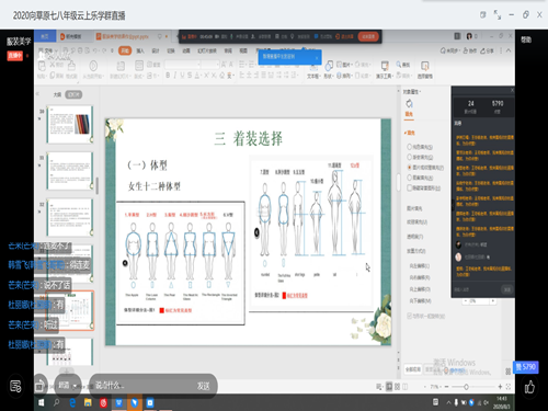 课程进行到第二、三章节,课堂进入有趣的师生互动阶段。老师提问到“自然美是什么?”员工们踊跃发言回答问题,他们答到内蒙古大草原的风景美就是自然美的表现。老师通过大自然的美过渡到服装美的问题,她讲到服装的设计有其背后的设计理念和文化意象,就像各个民族的服装呈现着各自民族的文化图腾。而后,老师亲切地与同学们交流大家穿过哪些布料制作的衣服以及各种布料的特点,同学们表示对呢绒布料有所了解,呢绒需要羊毛作为原料。紧接着,老师开始讲解第三个章节关于服装搭配的知识,孩子们对此表现出了极大的兴趣。她将不同的身材、脸型进行分类介绍,让孩子们选出自己属于哪一类型,有同学调皮地问到“苹果型身材难道头也是圆的吗?”此时,课堂上充满着师生们的欢声笑语,师生之间温暖的友谊超越了时空的界限。