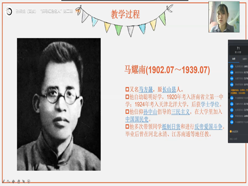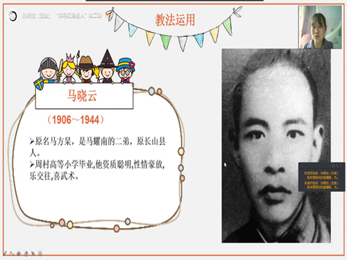 课程伊始,赵晓悦播放《一马三司令》短片,带领同学们一同重温上节课学习的内容。赵晓悦首先以提问的形式复习上节课内容,让同学们根据图片认出三位抗日英雄,帮助同学们加深印象。紧接着,她以三位抗日英雄中的马耀南英烈为重点,先梳理出他在抗战前、抗战时的一系列活动、事迹,再通过攻打邹平前、攻打邹平时、攻打邹平后三个视频短片进一步深入学习马耀南的英雄事迹。看过短片后,同学们以连麦的形式分享印象深刻的内容、个人的理解,用稚嫩的言语表达出对革命先烈深深的敬意。同学们分享完毕后,赵晓悦带领大家深入分析马耀南的人物性格和特点,并进行总结。