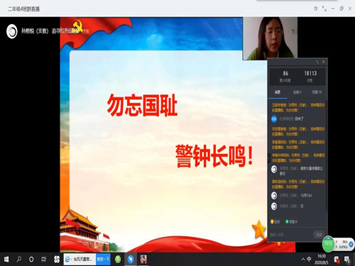 课程开始之前,张明明提前进入直播间调试设备,保证课堂正常进行。课程伊始,张明明带领同学们重温上节课所学的内容--《七律•长征》,并通过朗诵的形式帮助同学们加深印象。她以《七律•长征》为载体对律诗的具体知识进行讲解,并为同学们详细介绍首联、颔联、颈联、尾联在诗中的位置和特点。而后,张明明为同学们播放《台儿庄战役》影片,通过视频让同学们进一步体会战争的残酷性,重温历史,缅怀先烈。影片过后,同学们以连麦的形式积极分享自己的感悟,用青涩的语言表达他们对战争的痛心与反对。紧接着,张明明讲述故事《狼牙山五壮士》,并邀请同学们连麦朗读,进一步加深他们对革命先烈的敬仰之情。之后,张明明与同学们共同学习歌曲《歌唱祖国》。首先,她播放视频、展示图片,带领同学们欣赏祖国的壮丽风景与伟大建筑,增强其民族自豪感。其次,她重点从歌曲背景、歌曲情绪、歌曲风格等方面对歌曲进行分析讲解,并通过第一乐段和第二乐段节奏的对比,使同学们感受两种不同表现形式的不同音响效果和细微的情感差异。最后,进入感悟分享环节。同学们积极连麦、踊跃发言,认真分享交流自己在此次课堂的收获。课堂在热烈的气氛中结束。