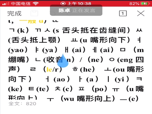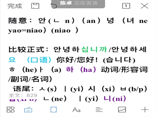 而后,她在讲解“问候语”的时候将其分为两大类别:随意问候和正式问候,并且讲解问候语的读音、适用的场合以及内涵意义。对于读音的学习,老师要求员工跟读,员工纷纷开麦认真朗读,课堂气氛活跃。其中斯琴搭娜对于韩语的跟读非常积极,得到了老师的表扬。之后,老师讲解怎样用韩语翻译“我是谁”,在讲解这一部分的过程中,陈卓对收音问题和发音时的口型以及口腔发力的部位做出补充,并以对话的方式进行展现。陈卓讲解回答“我来自哪里”的表述,要注意韩语的表述语序,以“我来自中国,你呢”为例,让员工进行表述,员工们的表述效果得到老师的称赞。陈卓还指出“前面单词有收音用을/은,无收音用를/는”,以“学习”这个词语的韩语为例进行说明。最后,她简要描述“职业”在汉语中的表达,把我们常见的汉语句式用韩语表示出来,最大限度的缩小与员工生活的距离,提高员工对韩语的学习兴趣。