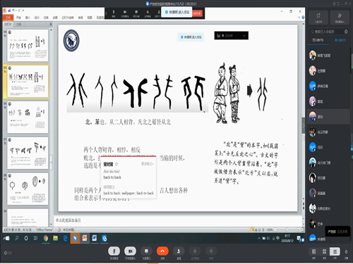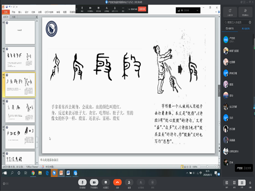 此次课程分为课程回顾、内容讲解、任务布置三个环节。课程开始之前,卢世姣带领员工回顾上节课所学内容,对关于“人”的古汉字知识进行提炼与升华。紧接着,课程开始新的内容,首先讲解与“人的变化”相关的古汉字。卢世姣分别对“化”“从”“比”“北”“众”“包”“重”“卧”等字进行讲解,从造字方法、起源与含义等方面介绍古汉字背后的故事,同时通过古汉字的图片展示来让员工来猜测现代汉字,师生互动频繁,课堂氛围浓厚。而后,卢世姣介绍关于“人的身体”的古汉字,通过“身”“殷”“尾”“肉”等字让员工了解关于人的身体的汉字的由来以及它们之间的关系。比如,从造字的方面来看,“殷”的字形像一个人被别人用棍子击打身体,手拿东西去刺身会流血,所以血的颜色叫殷红;同时,古人怀孕为“身”,把“身”字反过来就体现人的肚子如同人怀孕一般,形容人吃得东西多、东西丰厚,再加上右边的偏旁就表示富裕、殷实。最后,卢世姣说明下节课将学习疫情从古至今的变化并布置学习任务,希望员工分享此次疫情期间的感人事迹以及对于疫情的个人防护措施。