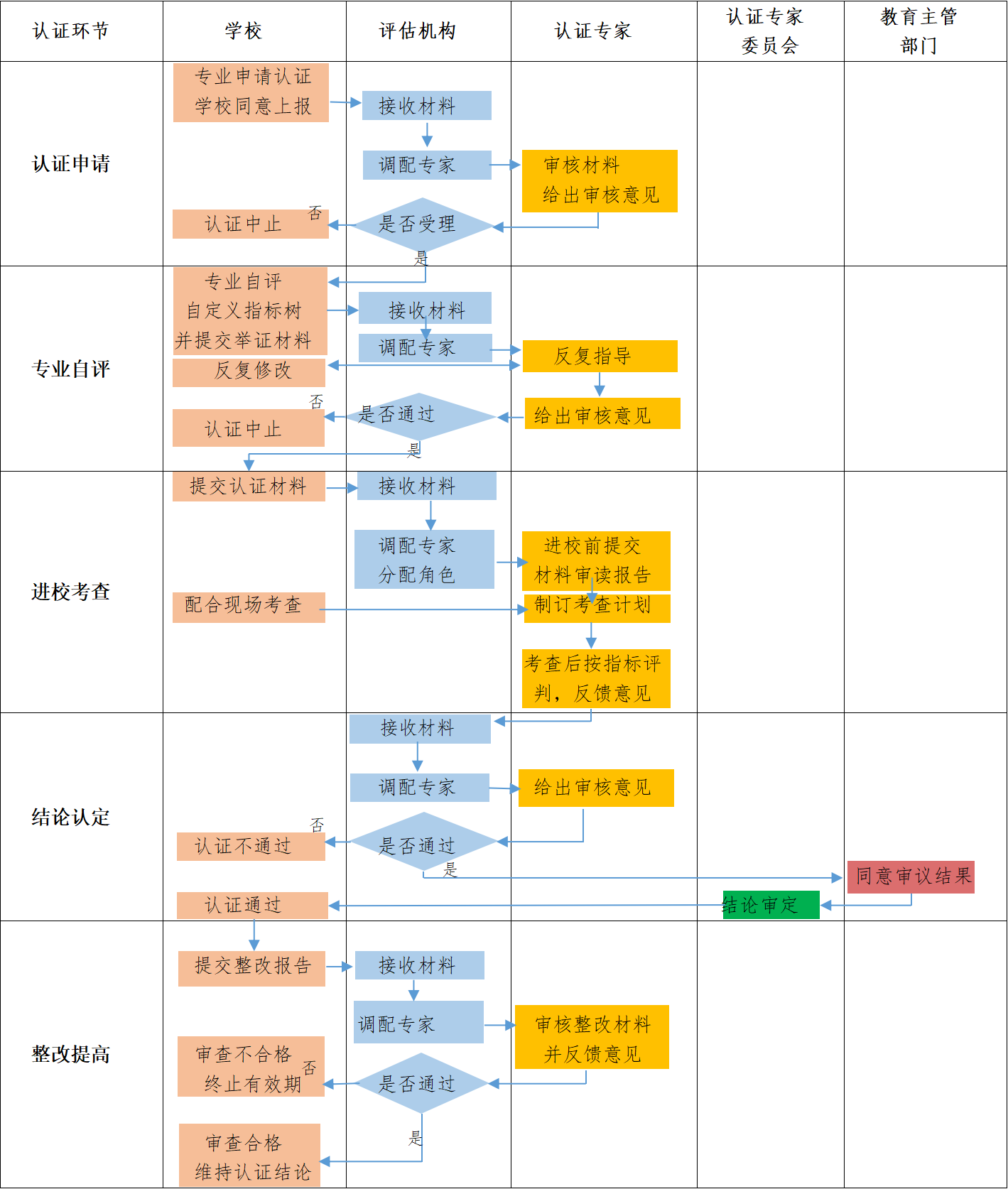 根据教育部印发的《普通高等公司师范类专业认证实施办法(暂行)》,师范类专业二级和三级的认证程序包括申请与受理、专业自评、材料审核、现场考查、结论审议、结论审定、整改提高等7个阶段。在本系统中,具体体现为五大环节,依次是认证申请、专业自评(含材料审核)、进校考查、结论认定(含结论审议和结论审定)、整改提高。系统业务流程分阶段分用户展示如下: