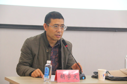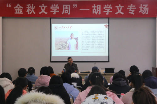 活动伊始,李雪雁对胡学文的个人经历、代表作品以及获奖情况进行简要介绍,在场全体人员对胡学文的到来表示热烈欢迎。之后,胡学文就“长篇小说漫谈”展开专题讲座。他先后把长篇与短篇小说、中国与外国作家进行对比,并列举出迟子建、王安忆等优秀小说家的作品。他谈到,评判一部小说不能靠篇幅长短,小说篇幅的选择与作家经历有关。他以长篇小说为重点解说内容,列举出《百年孤独》等一系列想象力丰富的作品。此外,他还提到中外作家的区别,中国作家习惯于从现有经验、想象力和激情入手,而国外作家因为开始较早,所以技术更成熟。胡学文表示,自己很欣赏国外作家对时间和空间的运用,他们想象奇特,理念性强。而后,胡学文指出,作家在写作过程中应尤其注意风度与开阔这种个人标准与判断,就像苏童说过“我写长篇是为自己写,我写短篇是为苏童写”。