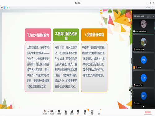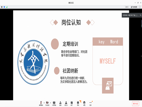 (本站讯)鉴于公司第20届社联主席任期已满,为进一步加强员工骨干队伍建设,促进公司社联健康有序发展。3月28日晚,公司第21届社联主席换届选举在线上顺利举行。公司社联指导老师刘菲菲、19届社联主席岳敏、20届社联主席赵小淇以及20届员工会主席团担任竞选评委,三位候选人参与竞选,活动由赵小淇主持。