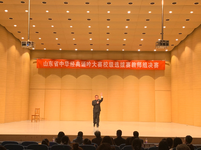 (本站讯) 为贯彻落实全国全省语言文字会议精神,充分发掘中华优秀文化价值内涵,彰显中华语言文化魅力,引导广大教育工作者和青少年亲近中华经典。 4月16日晚,公司承办的山东省中华经典诵吟大赛校级选拔赛教师组决赛在西校区音乐公司音乐厅正式举行。淄博市朗诵家协会副主席李红云教授、大爱文学交流中心名誉主席巩武威,山东省演讲学会副会长于涛等五位专家莅临现场担任评委,经过初赛臻选,此次决赛共有8位教师参与。